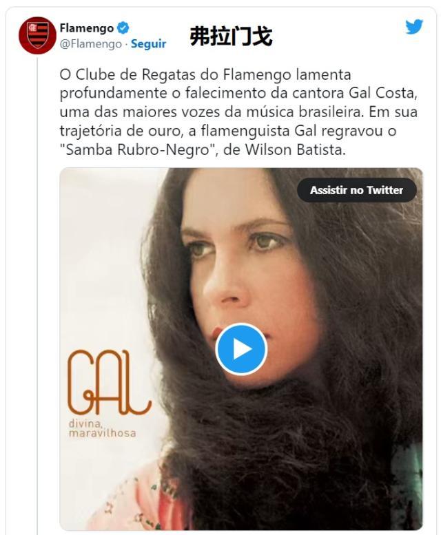 弗拉门戈俱乐部写:“我们沉痛悼念歌手嘉尔·科斯塔去世,她是巴西音乐史上最伟大的声音之一。在她灿烂的音乐生涯中,弗拉门戈球迷嘉尔·科斯塔还演唱过威尔逊·巴蒂斯塔创作的《红黑桑巴》。”