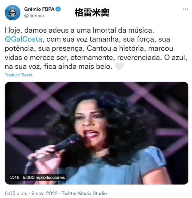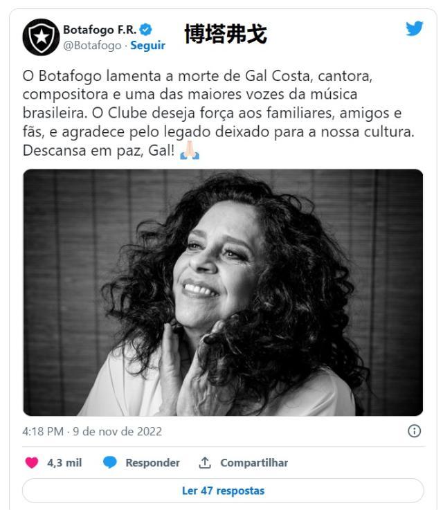 2022年11月9日,巴西女歌手嘉尔·科斯塔在圣保罗因病去世,享年77岁。很快,巴西几乎所有重要的足球俱乐部都发布了悼词,其中不乏格外深情的语句。