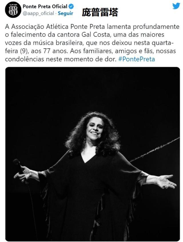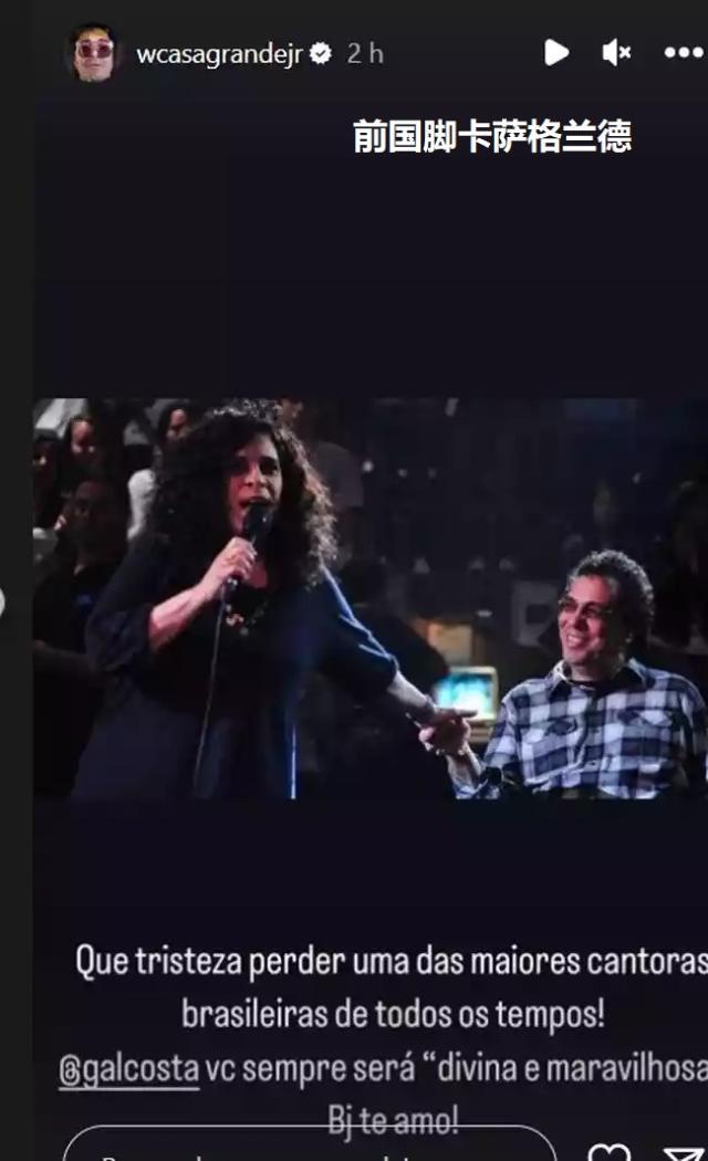 克鲁塞罗俱乐部写:“今天我们送别巴西音乐最伟大的艺术家之一。嘉尔·科斯塔,您曾是也永远是巴西人心中的“激情与狂欢节”。给家人、朋友和歌迷们送上慰问。”